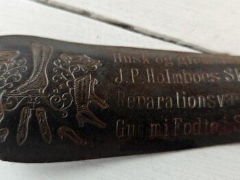 Skohorn med reklame. Husk og glem aldrig. J. P. Holmboes Skotøjsforretning. Aarhus