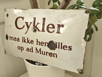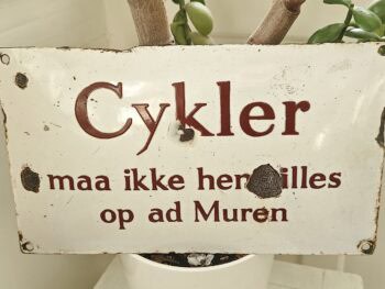 Cykler. Maa ikke henstilles op ad Muren. Emaljeskilt fra statsbanerne