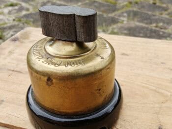 Afbryder. Trappeafbryder (vrider). Messing og porcelæn m. bakelit-vrider. Model 3