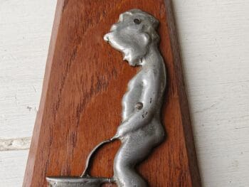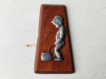 Toiletskilt med dreng som tisser. Støbt tin på teaktræ