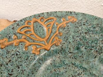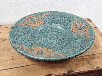 Fad. Grøn-nistret med orange mønster. Ø31,5 Michael Andersen. Bornholm