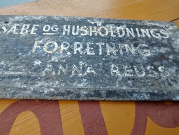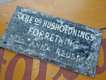 Sæbe og husholdningsforretning indeh. Anna Reuss – Blikskilt