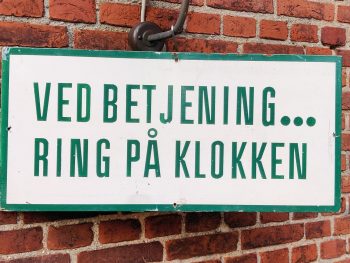 Ved betjening… Ring på klokken. Mellemstort skilt i bemalet træ