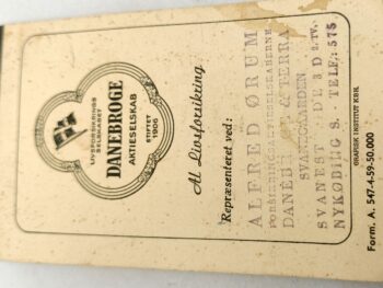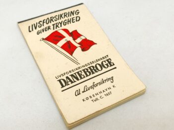 Notesblok med reklame for Livsforsikringsselskabet Danebroge. Livsforsikring giver Tryghed. København K Tlf. C 1657