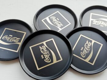 Drik Coca Cola. Bordskånere i sort plast. Sæt af 5