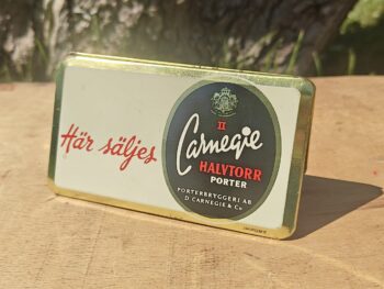 Carnegie Halvtorr Portor. Bordskilt i blik. Dobbeltsiddet