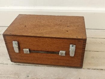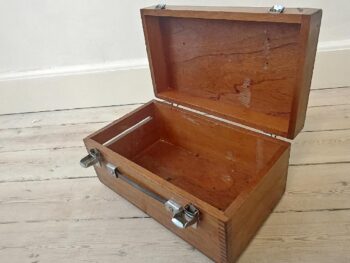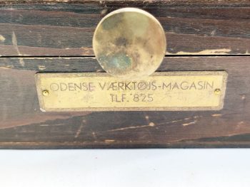 Odense Værktøjs-Magasin Tlf. 825. Lille trækasse med blikskilt
