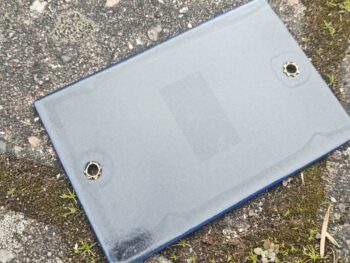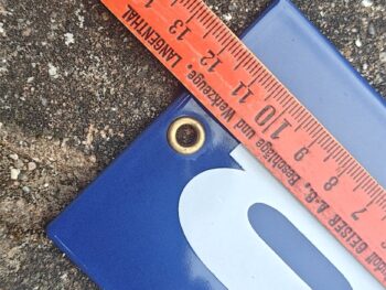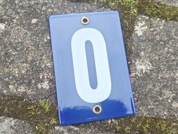 Emaljeskilt. 0 (nul eller O). Hvid tekst på blå bund
