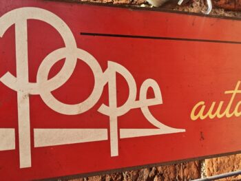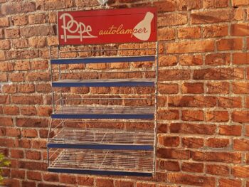 Pope Autolamper. Gammel udstillingsreol med skilt fra autoværksted