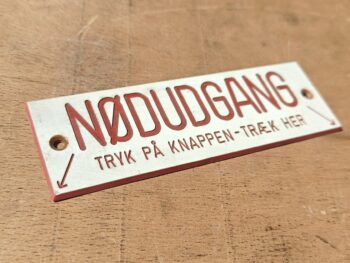 Sporvognsskilt. Nødudgang – Drej håndtaget – Træk her
