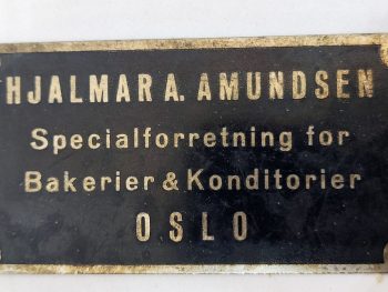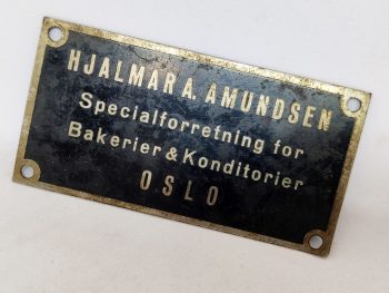 Lille metalskilt fra Hjalmar A. Amundsen Specialforretning for Bakerier & Konditorier OSLO