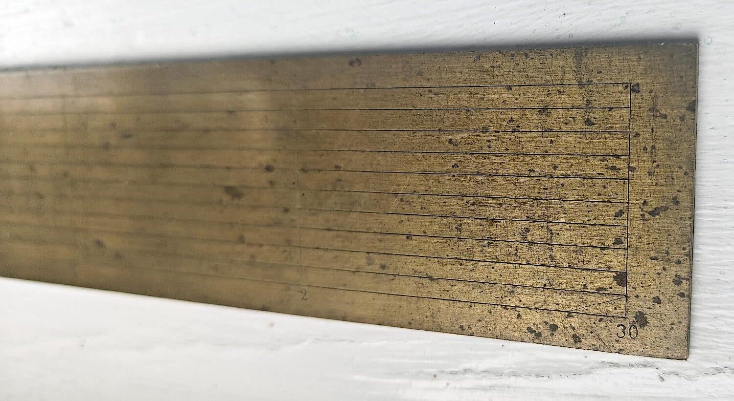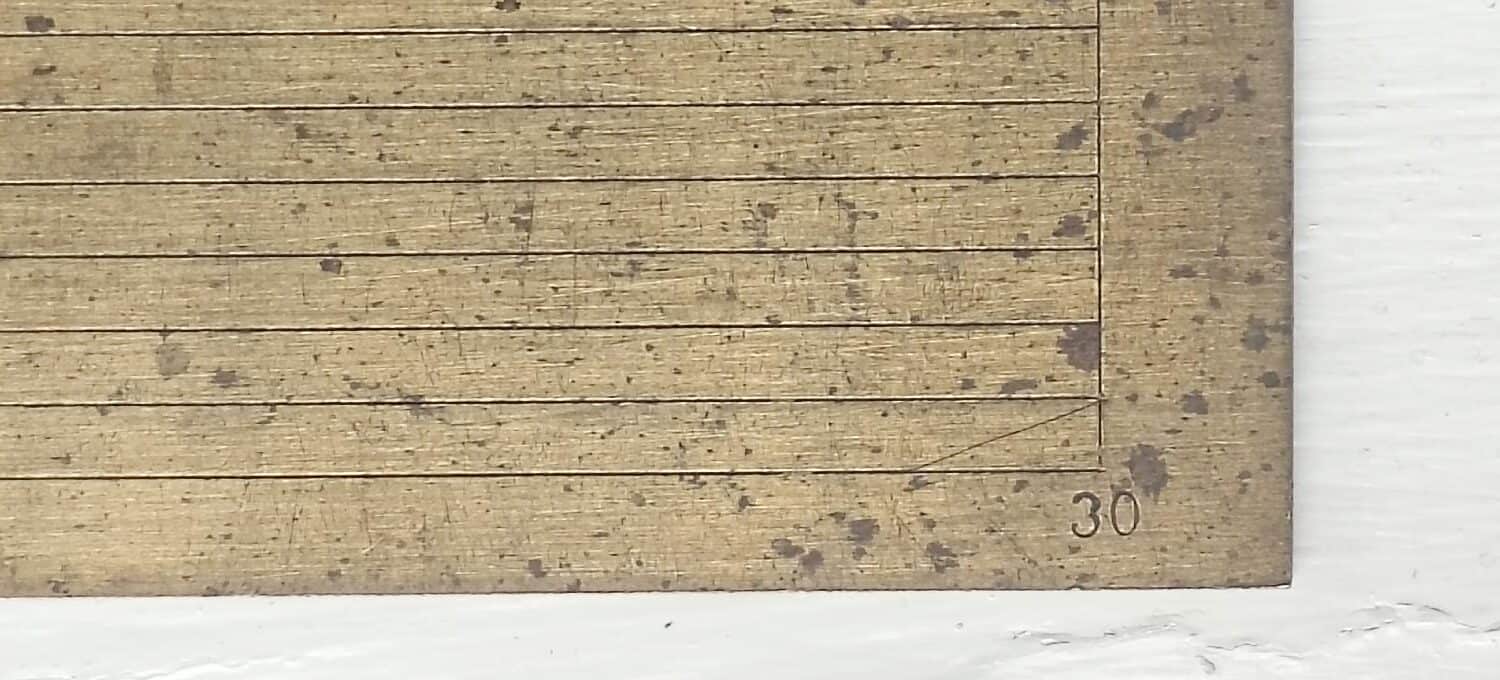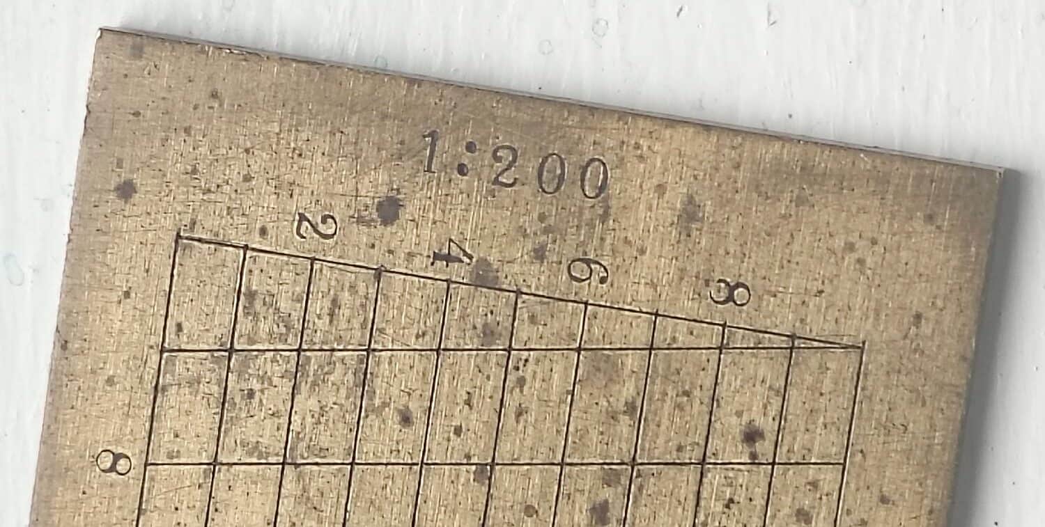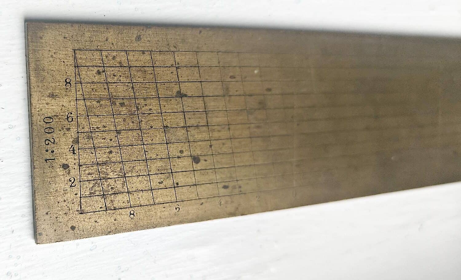 Antik metal (måske bronze) diagonalmålestok fra Cornelius Knudsen, København med skala 1-800, 1-2000, 1-4000 dobbeltsidet
