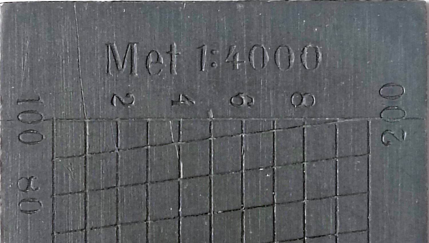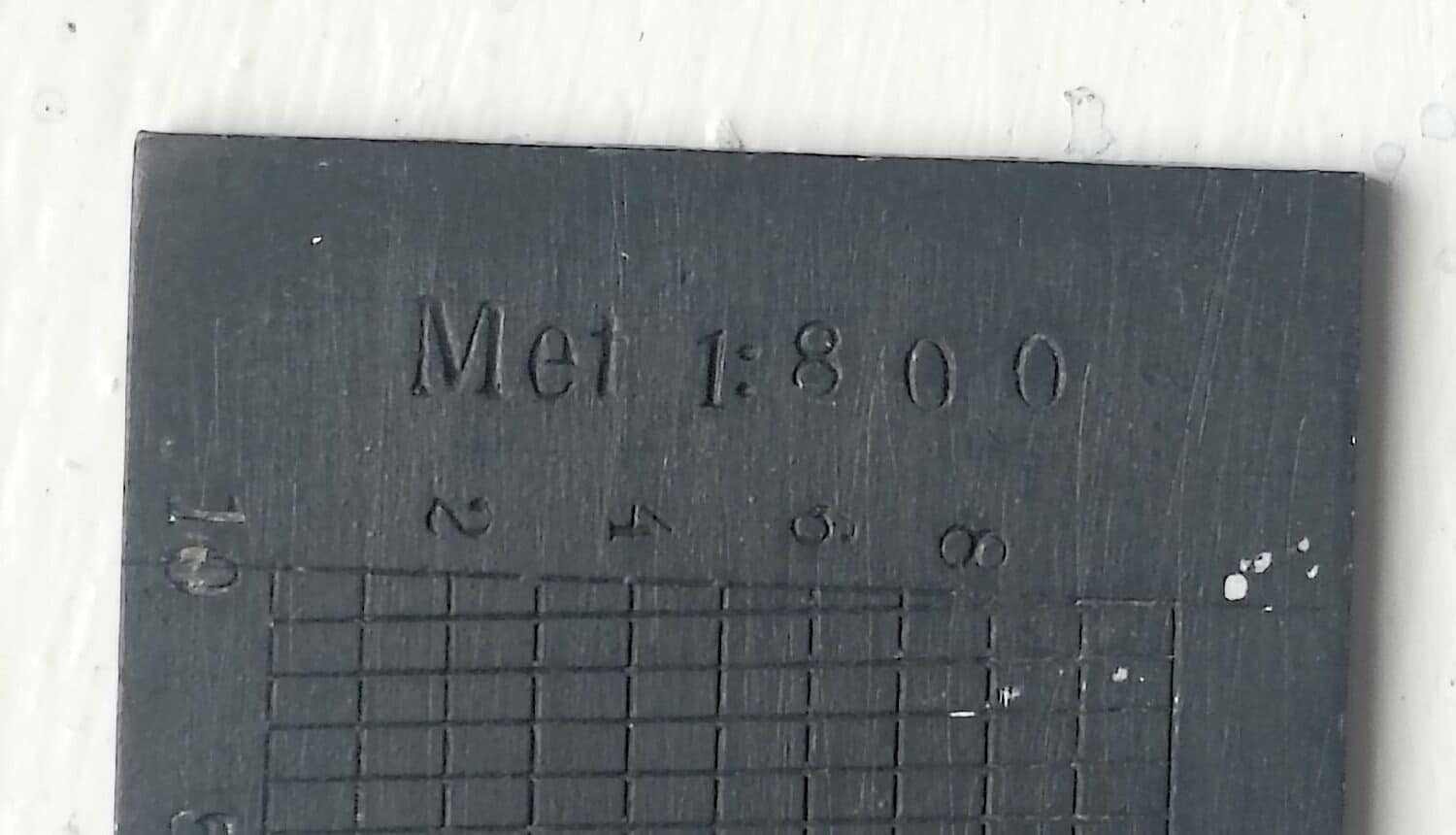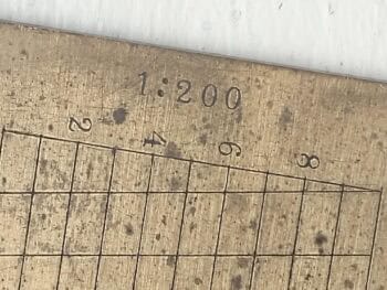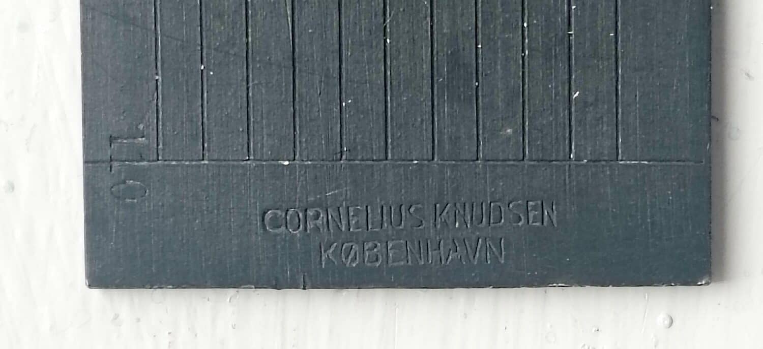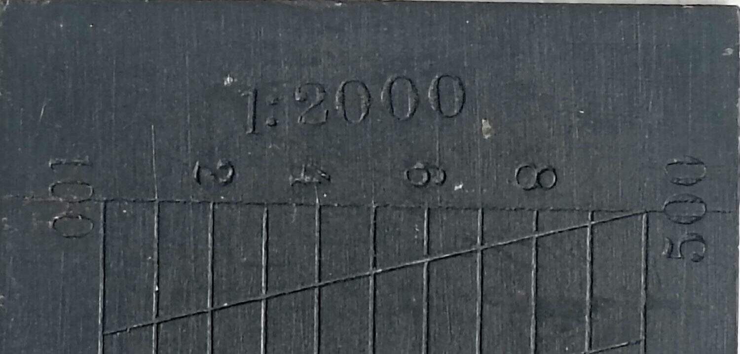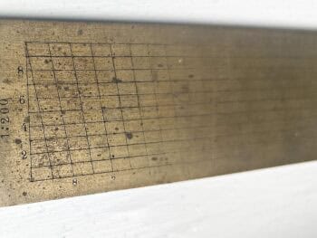 Antik metal (måske bronze) diagonalmålestok fra Cornelius Knudsen, København med skala 1-800, 1-2000, 1-4000 dobbeltsidet