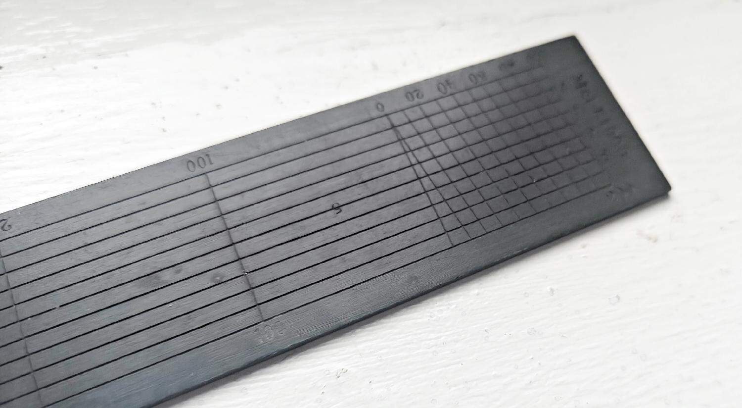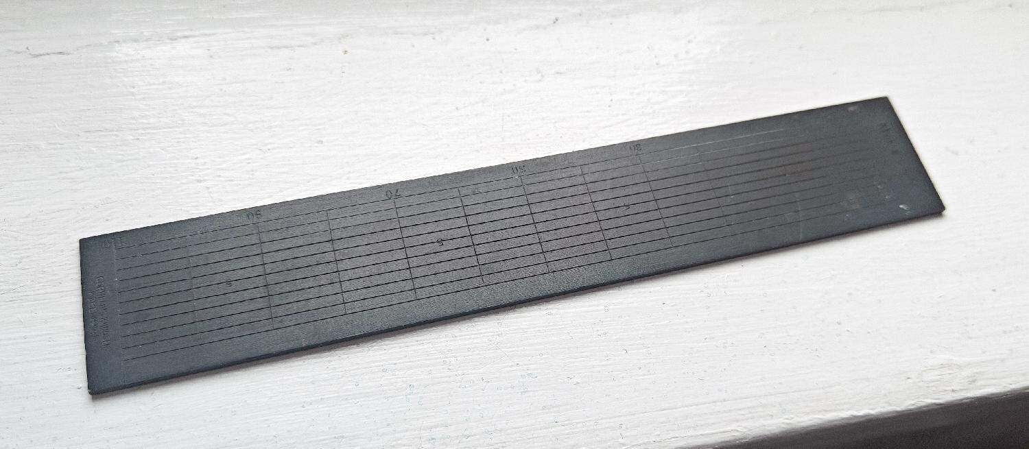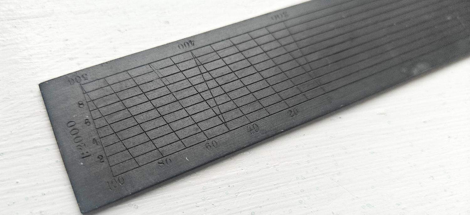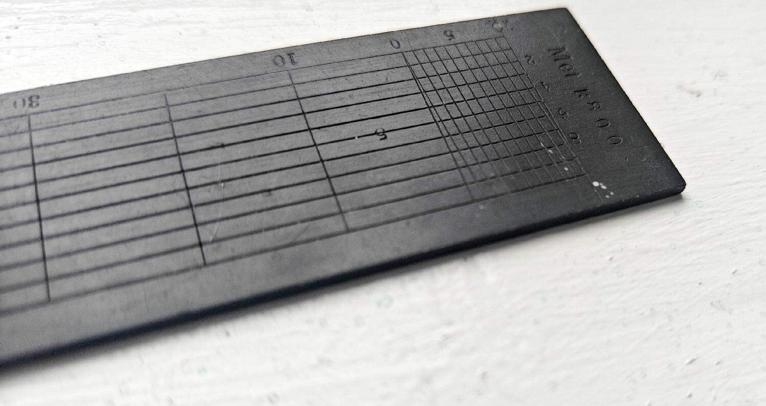 Antik metal (måske bronze) diagonalmålestok fra Cornelius Knudsen, København med skala 1-800, 1-2000, 1-4000 dobbeltsidet