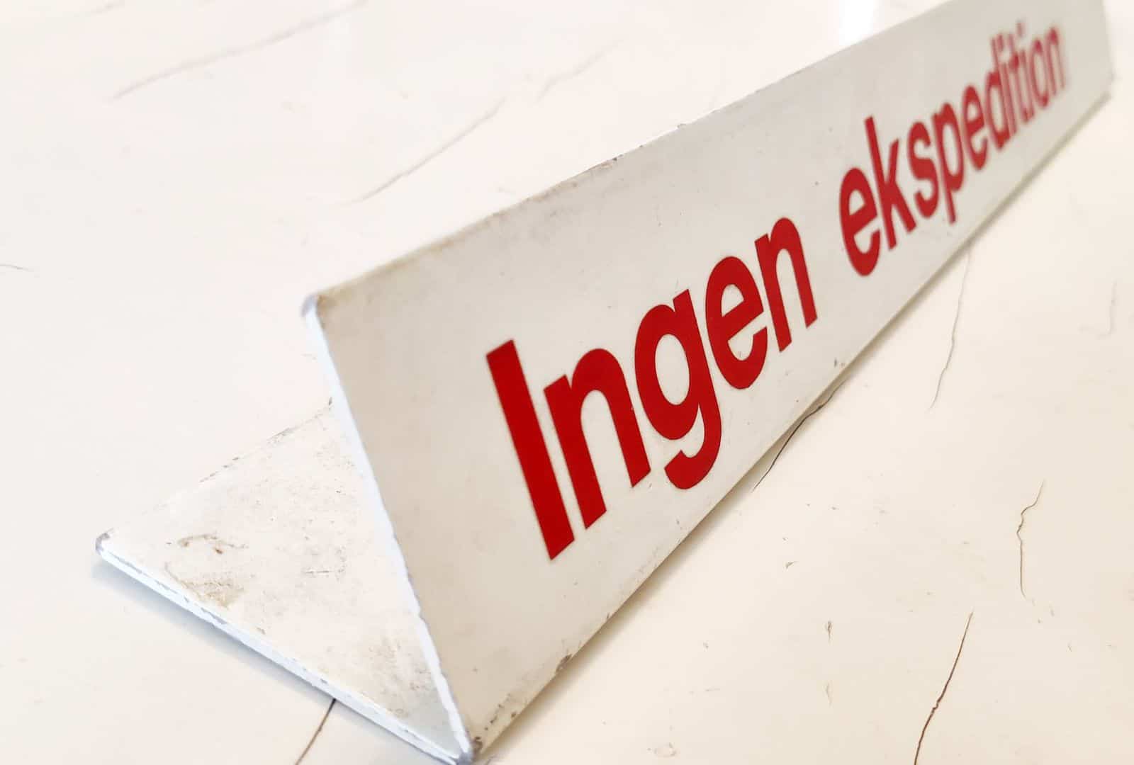 Aflangt enkeltsiddet skilt i aluminum. Fra posthus, bank eller tilsvarende hvor “lugen” kunne være lukket og der derfor ikke var nogen ekspedition.