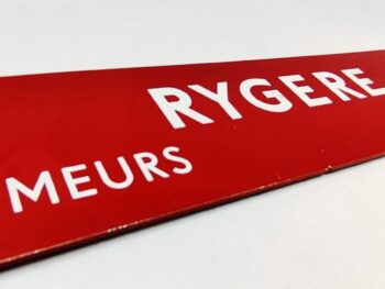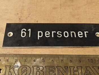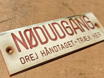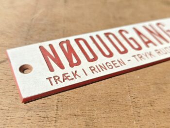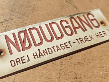 Sporvognsskilt. Nødudgang – Drej håndtaget – Træk her