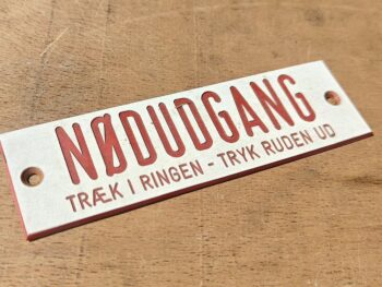 Sporvognsskilt. Nødudgang. Træk i ringen. Tryk ruden ud
