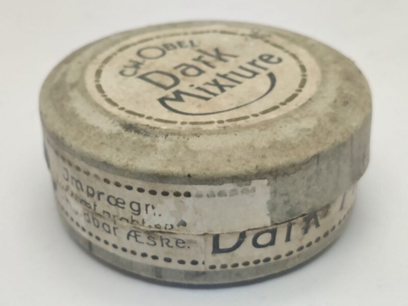 Tudsegammel tobaksdåse i hård pap. Formentlig fra starten af 1900-tallet.