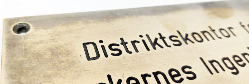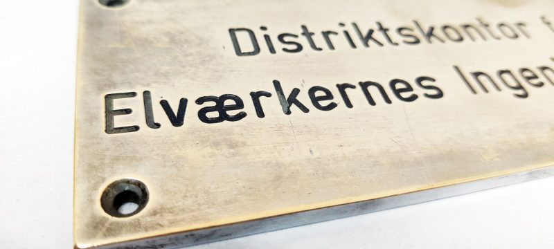 Distriktskontor for Elværkernes Ingeniørkontor skilt i massiv forniklet messing