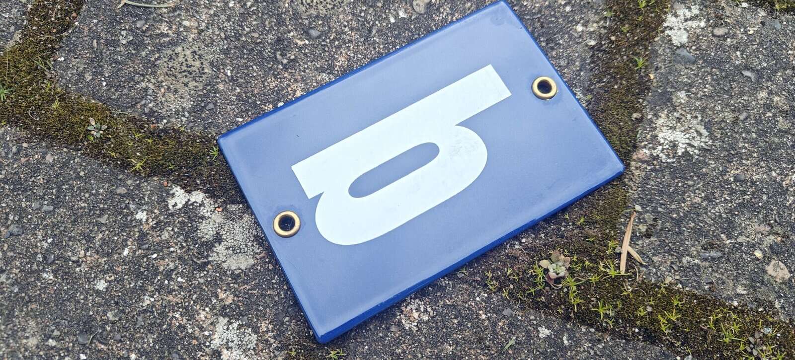 Emaljeskilt. “b”. Hvid tekst på blå bund