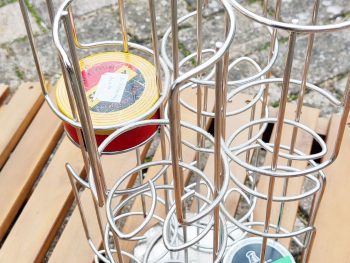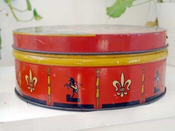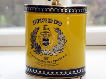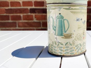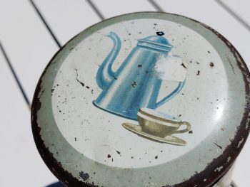Kaffedåse med plantagearbejdere og madamblå på toppen