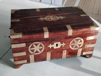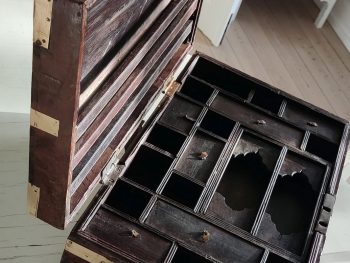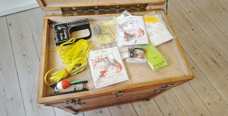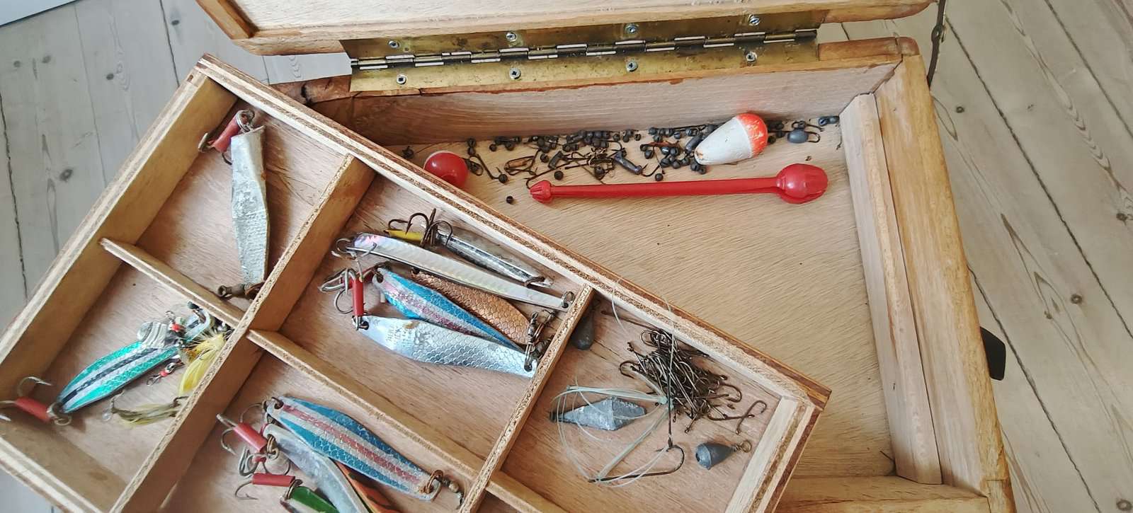 Lækkert gammel lystfisker kasse med flere rum til både grej og fangst.
