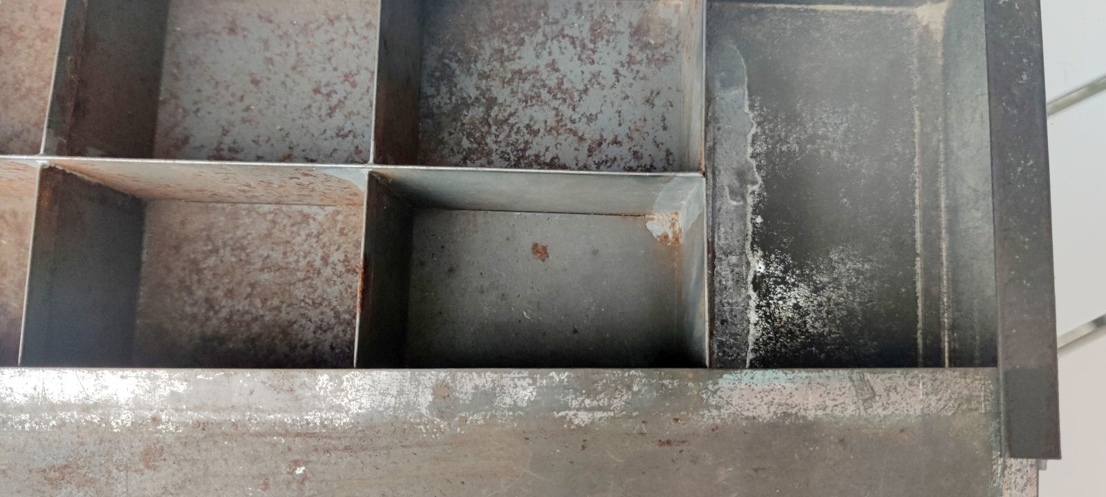 Dejligt håndbygget blikæske med gode rum og låg og glider nemt af og på.