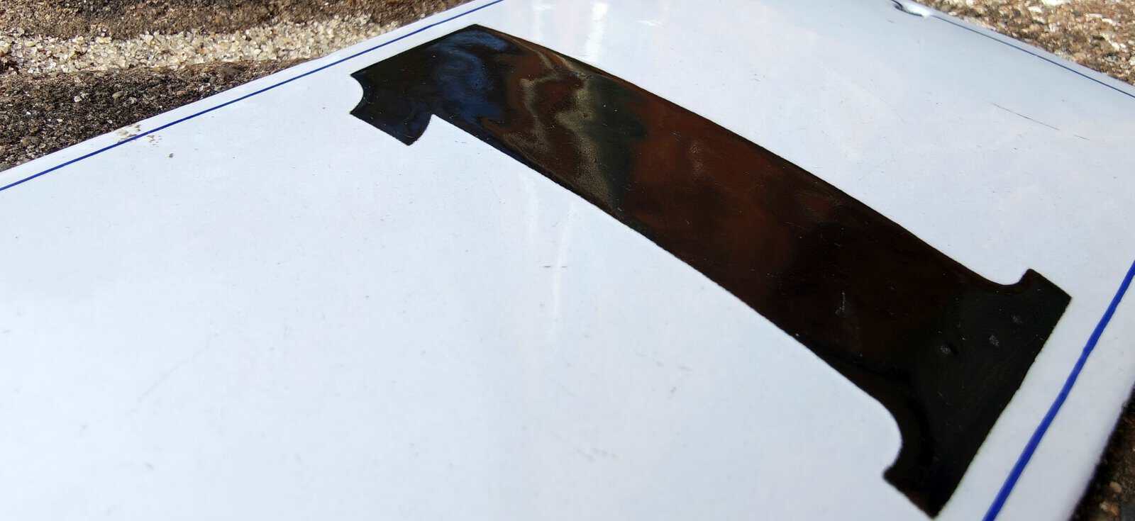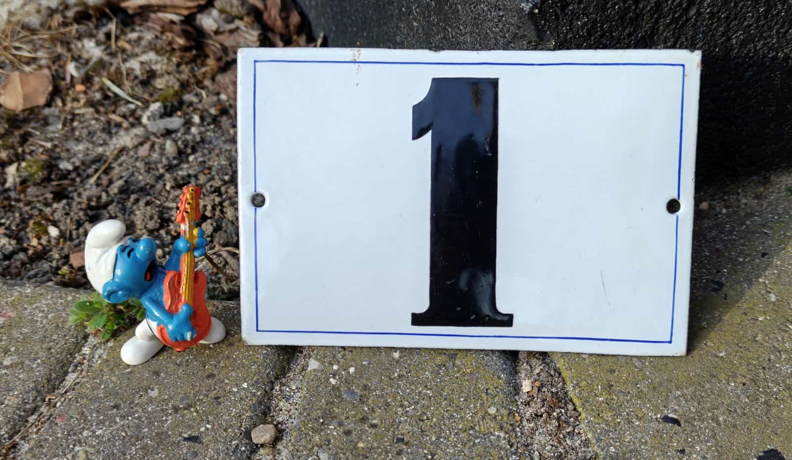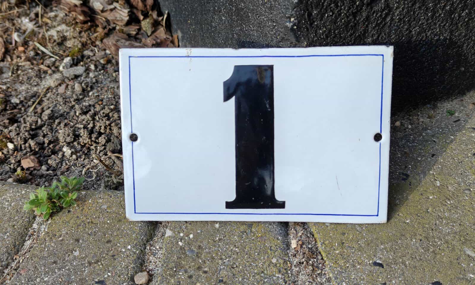 Husnummer 1. Sort på hvid bund. Emaljeskilt