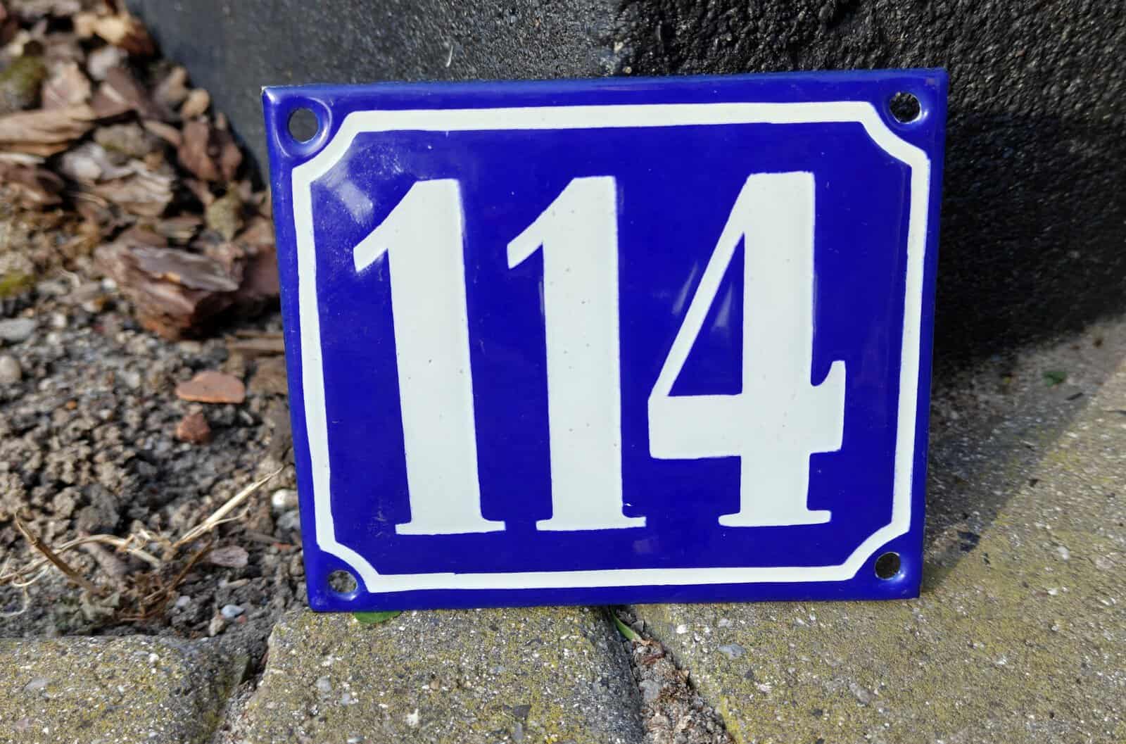 Husnummer 114. Blå hvid. Klassisk. Emaljeskilt