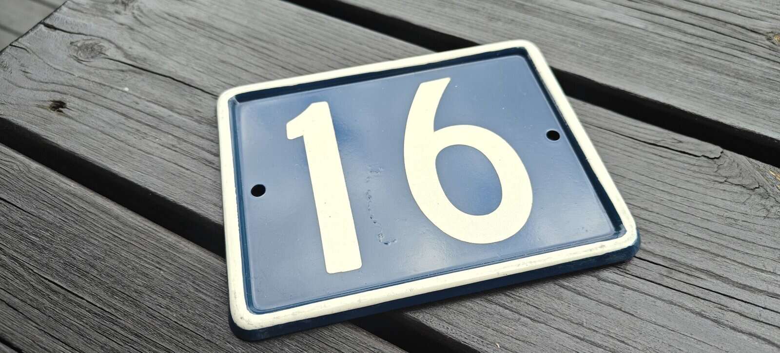 Husnummer – 16 – Udstandset metal. Bemalet. Ældre dato