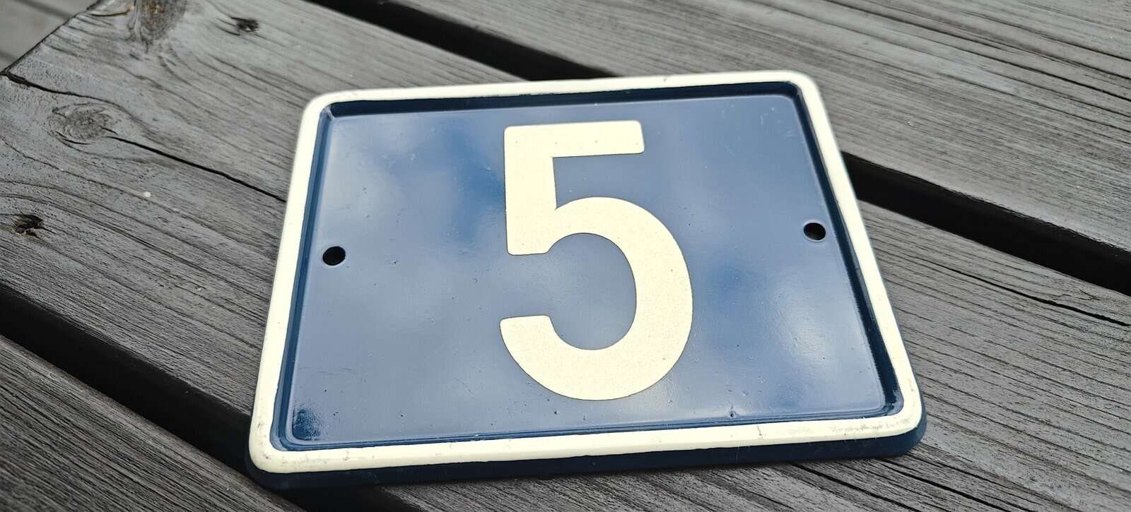 Husnummer – 5 – Udstandset metal. Bemalet. Ældre dato