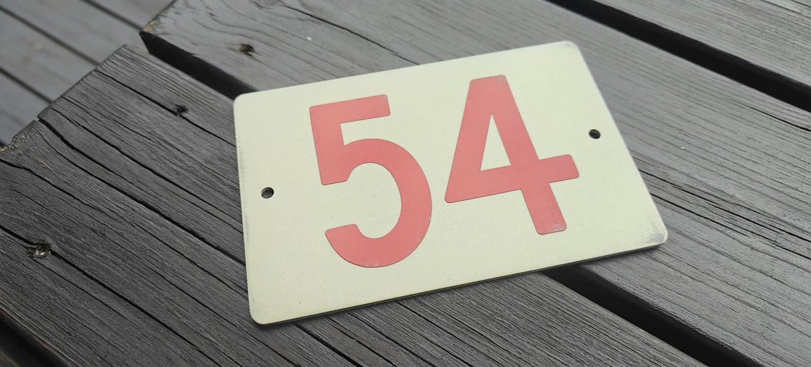 Husnummer – 54 – Rød tekst på hvid bund. Tryk på metalplade