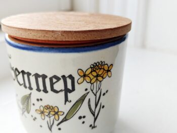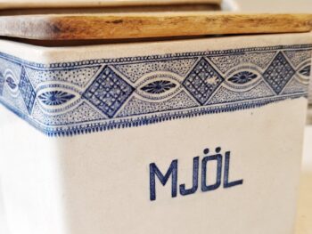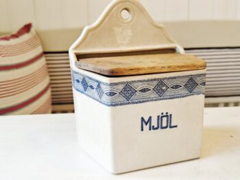 Melkrukke i fejance med trælåg. Mrk. Mjöl