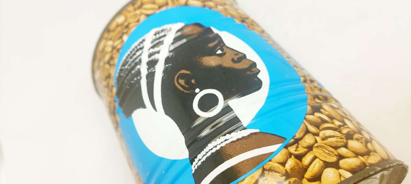 Kaffedåse med plantagearbejdere og madamblå på toppen