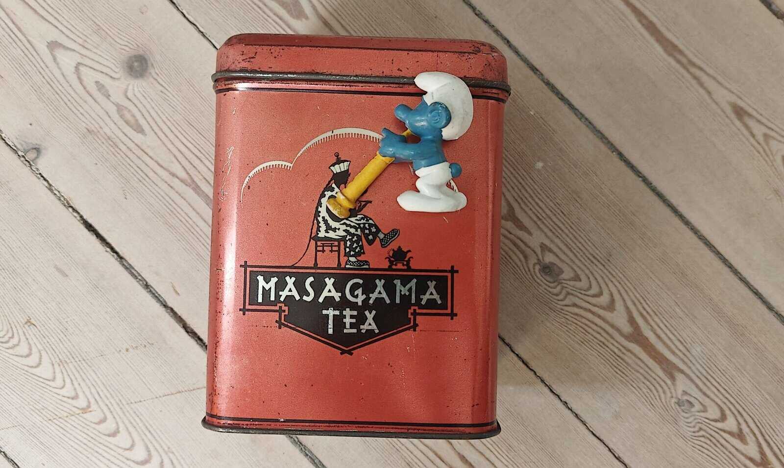Kaffedåse med plantagearbejdere og madamblå på toppen