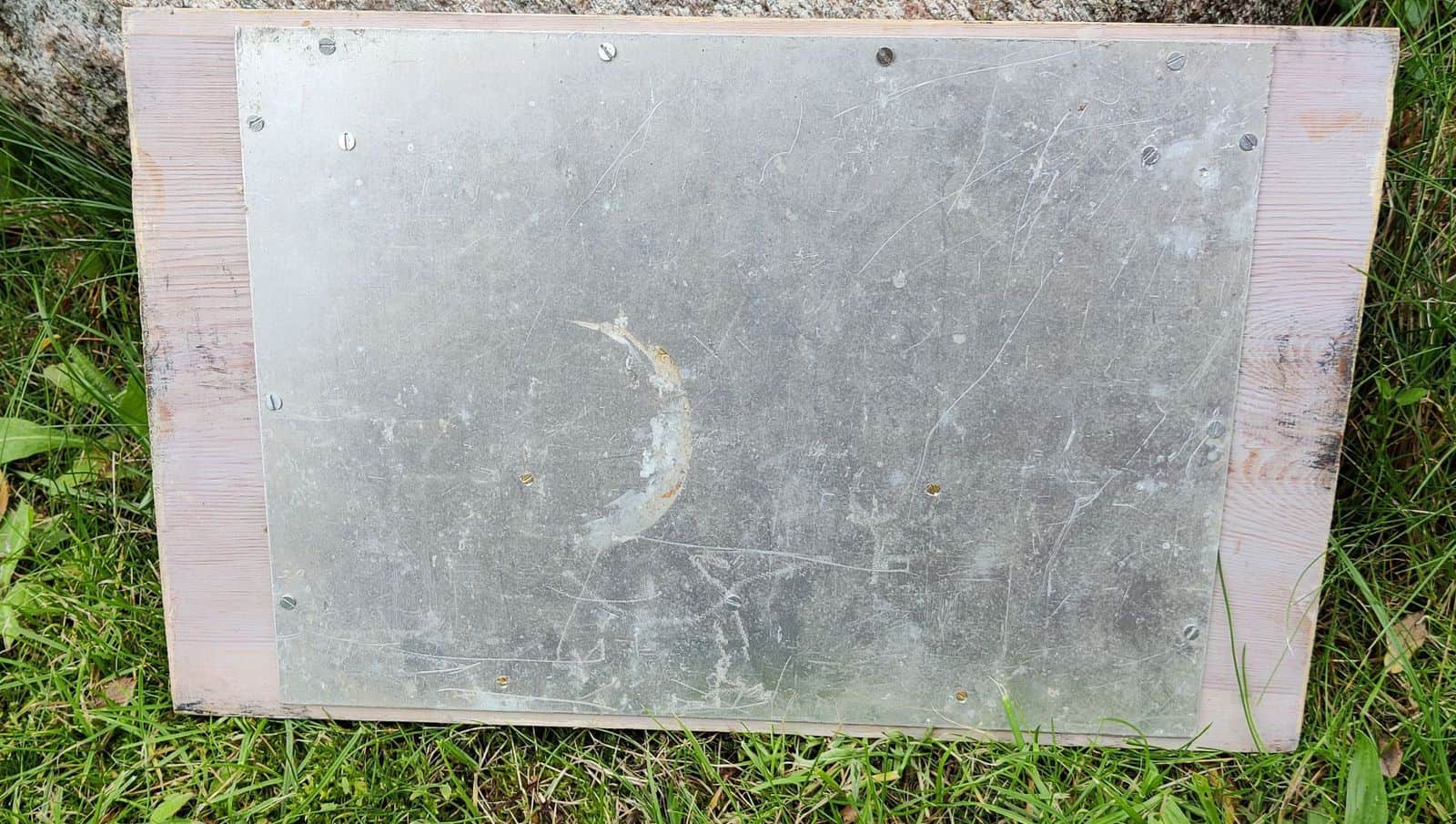 Gammel træskilt fra Radio / TV butik. Metalplade på bagsiden