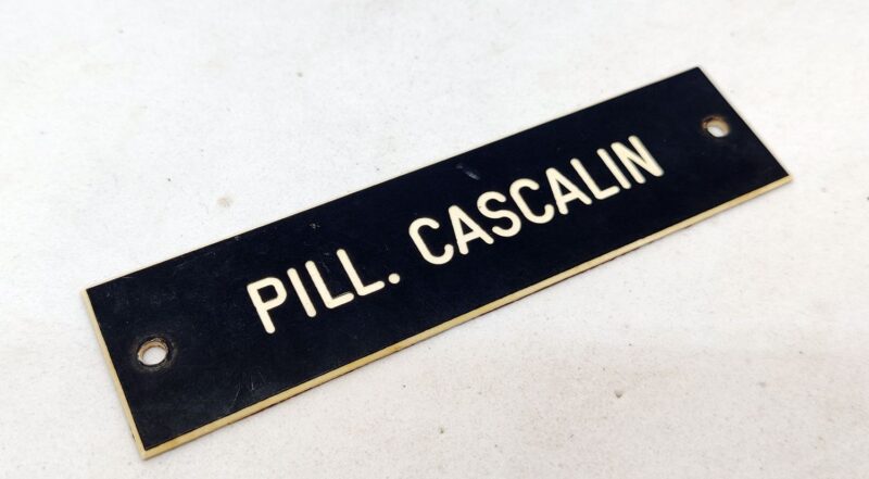 PILL. CASCALIN. Ældre apotekerskilt i hård plast (10,5 x 2,5cm)