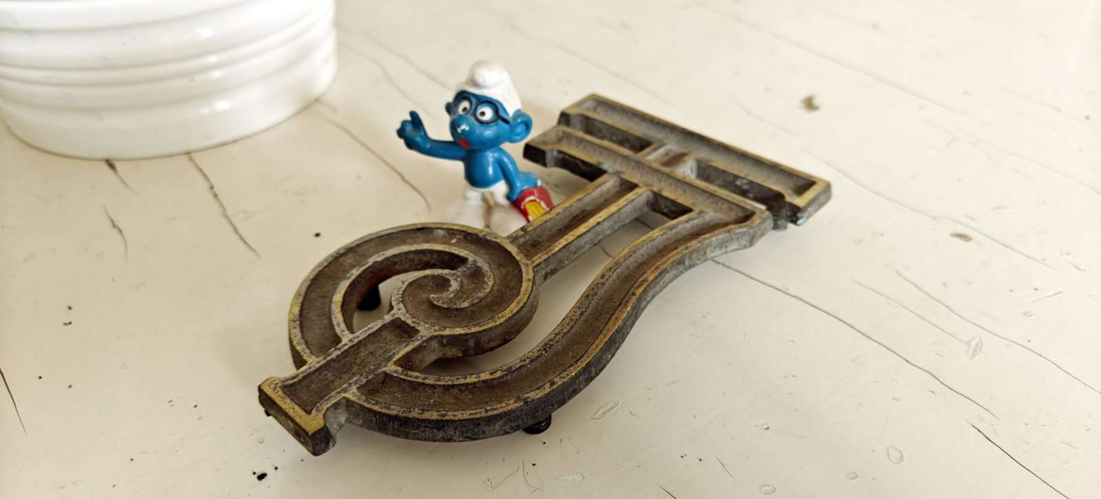 Lækkert og tungt gammel skilte. 4 gevindstænger på bagsiden til ophæng/montering.