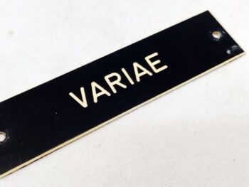 VARIAE. Ældre apotekerskilt i hård plast (10,5 x 2,5cm)