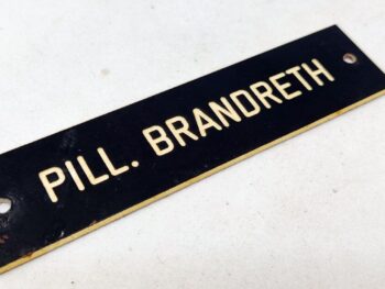PILL. BRANDRETH. Ældre apotekerskilt i hård plast (10,5 x 2,5cm)