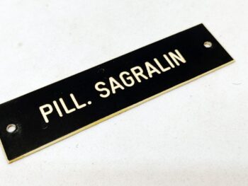 PILL. SAGRALIN. Ældre apotekerskilt i hård plast (10,5 x 2,5cm)