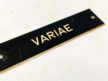 VARIAE. Ældre apotekerskilt i hård plast (10,5 x 2,5cm)