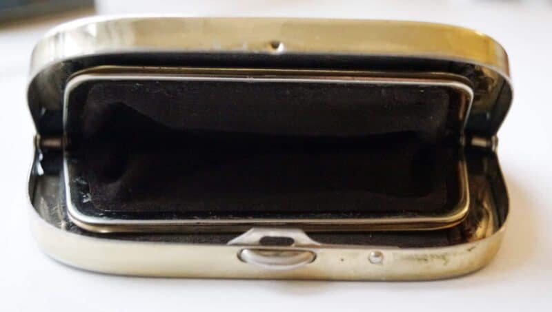 Gammel Taxipung. Lås virker. Forniklet messing med læder.