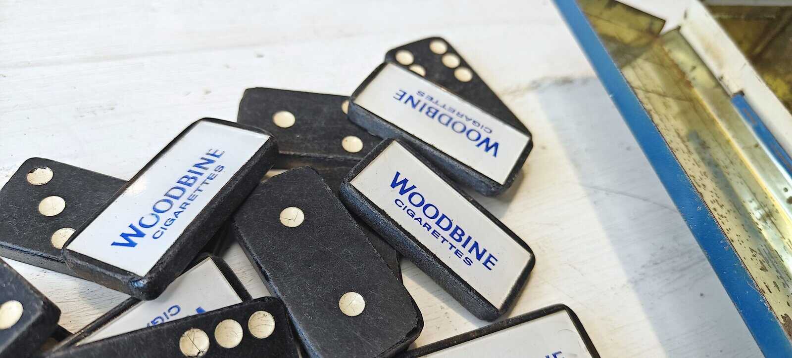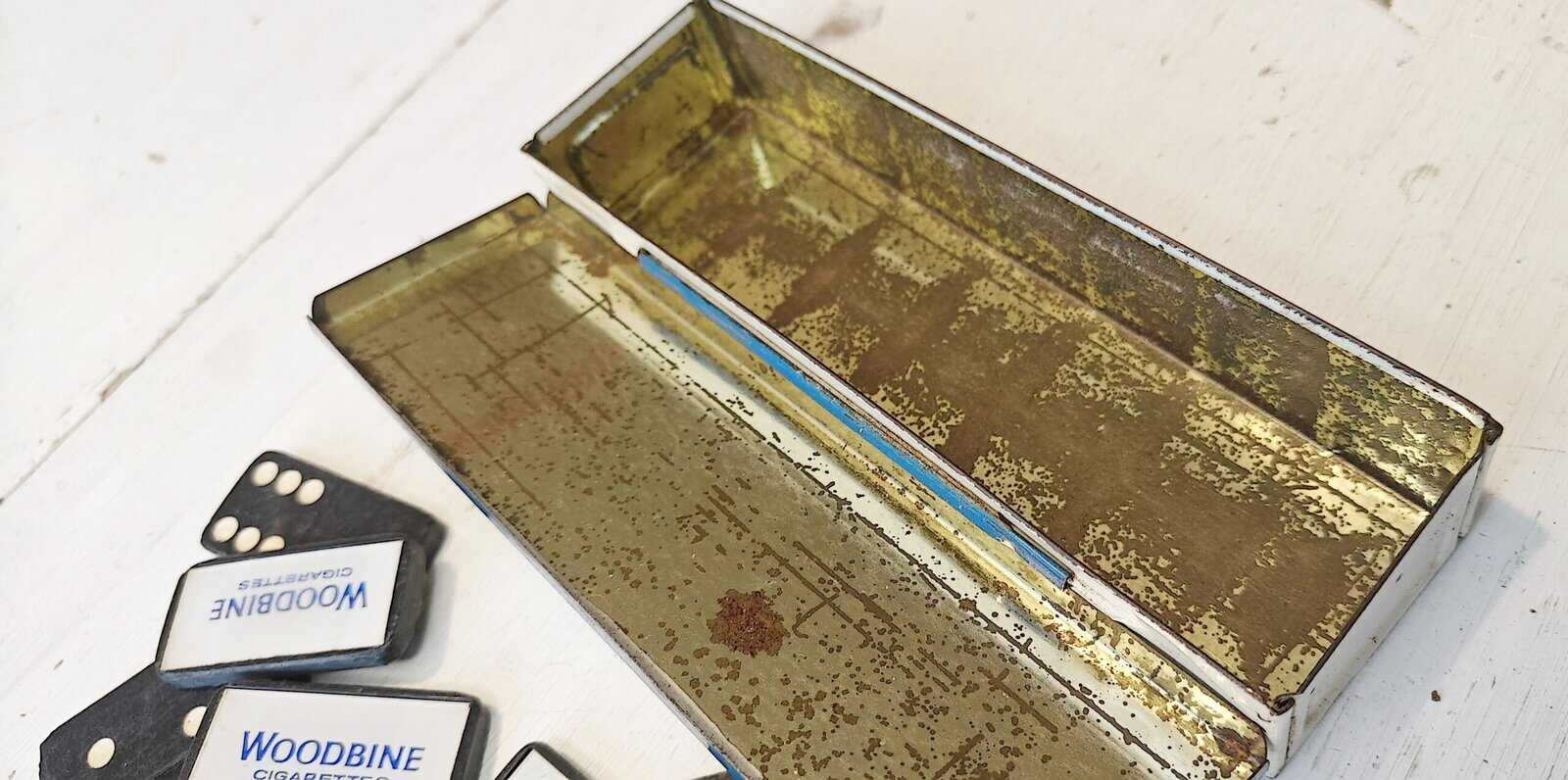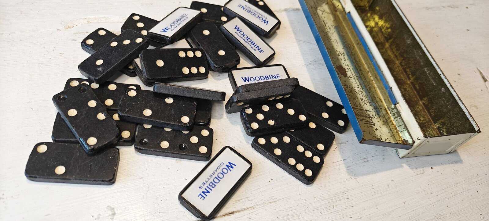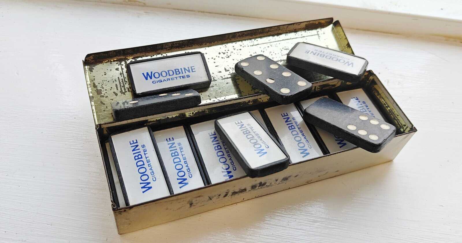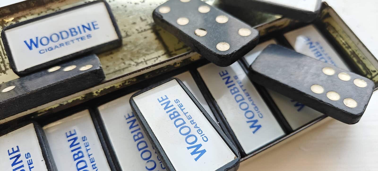 Woodbine. Cigarettes. Dominosæt i blikæske med reklame