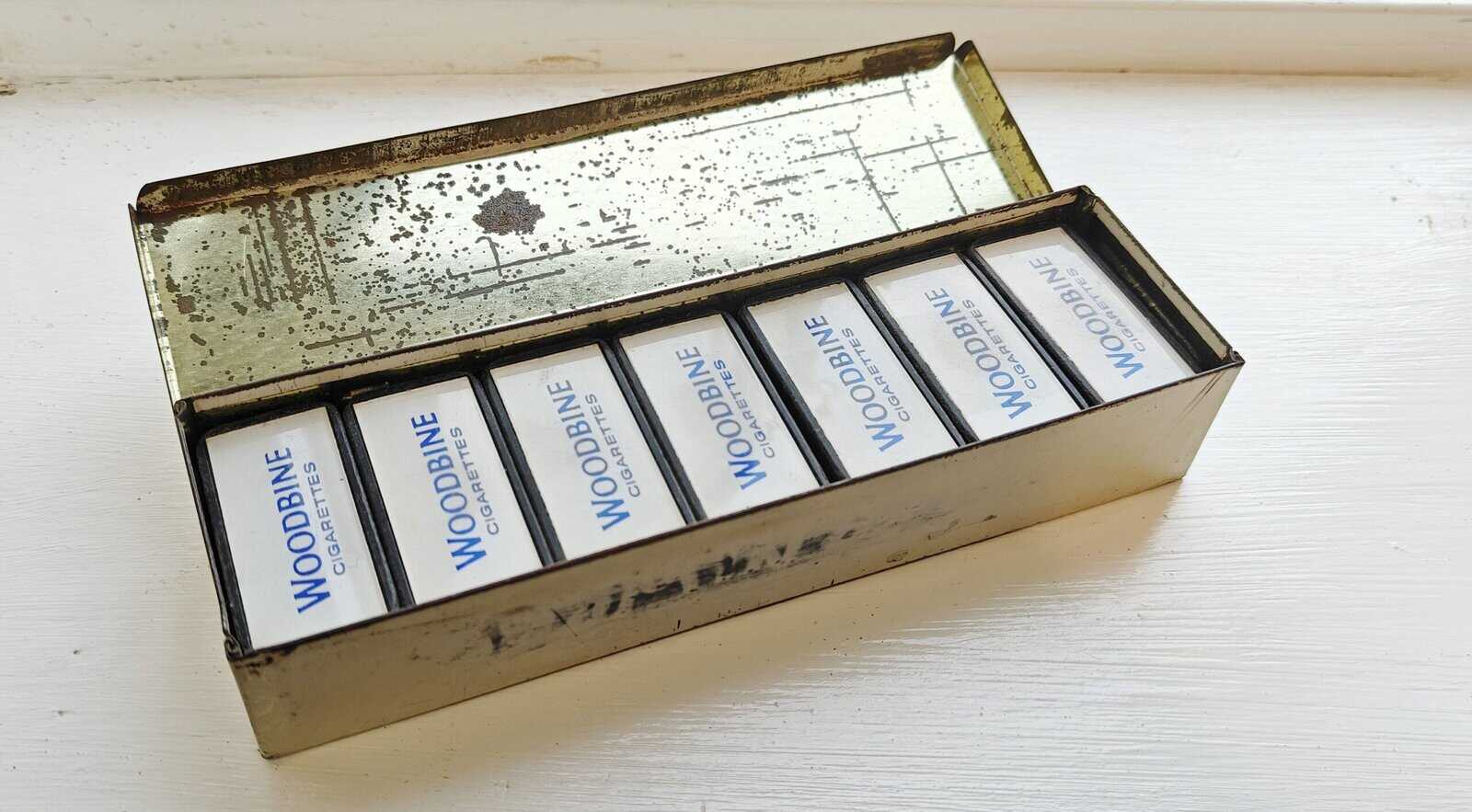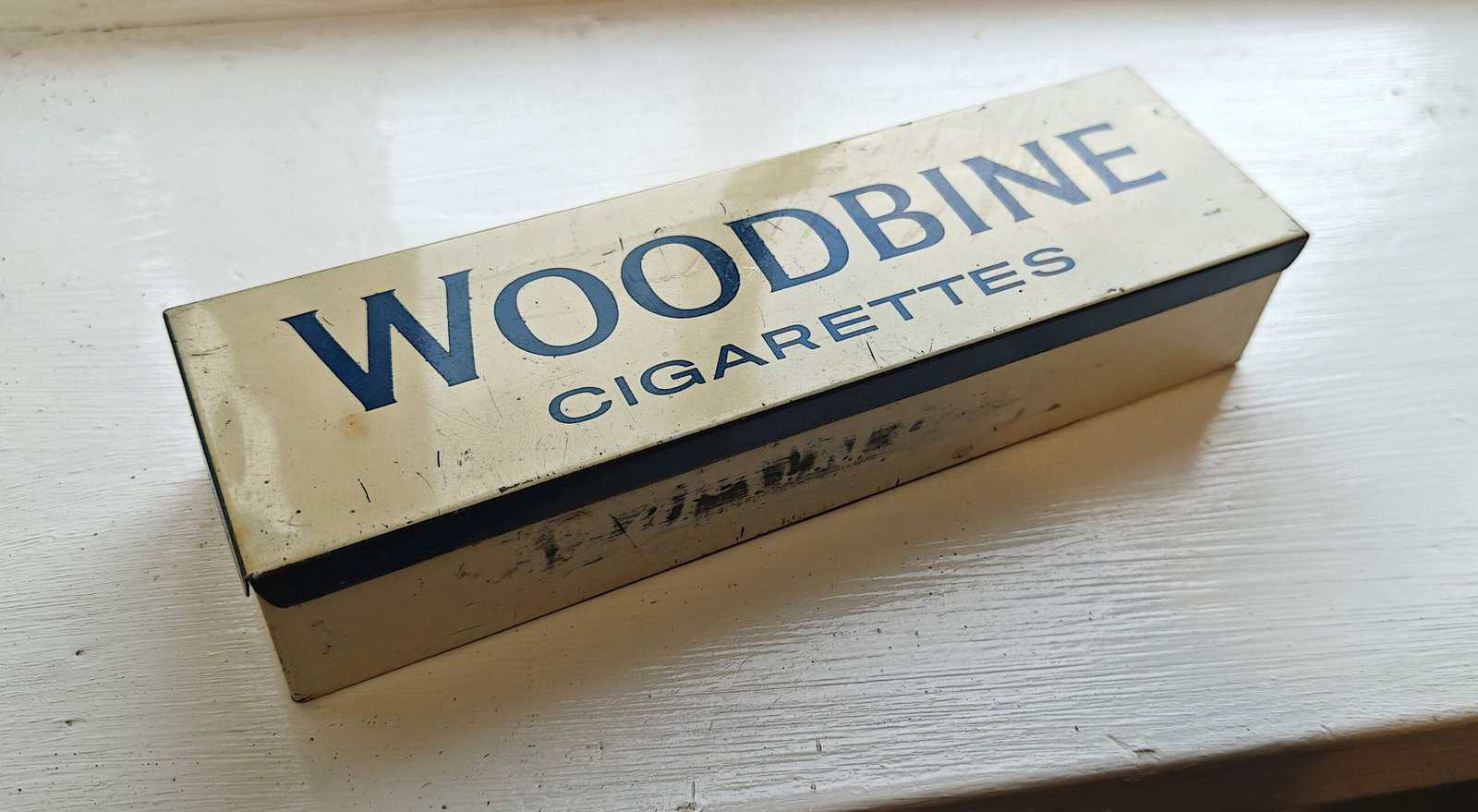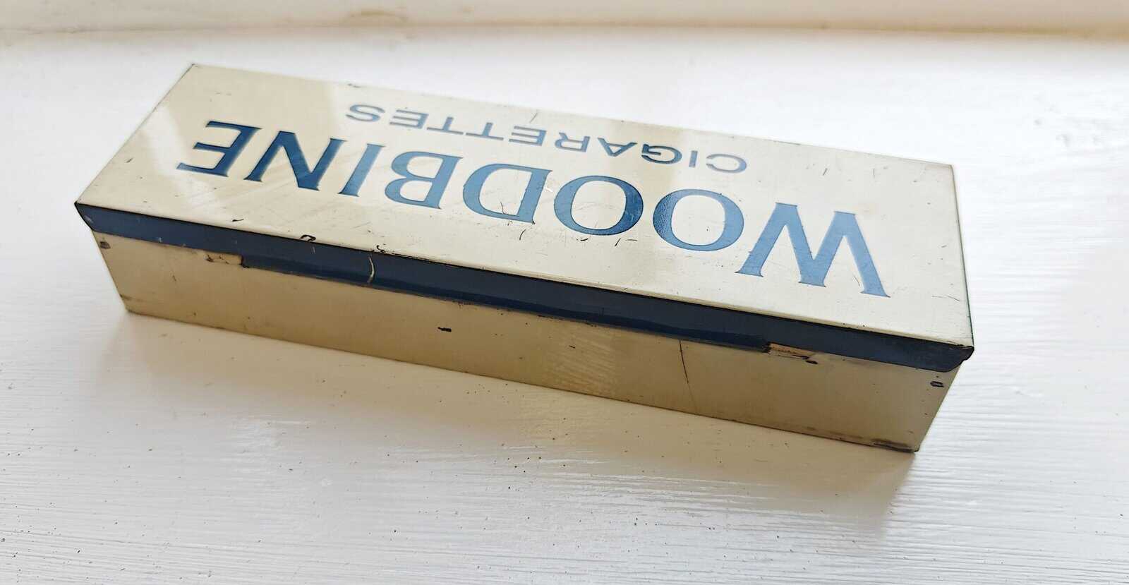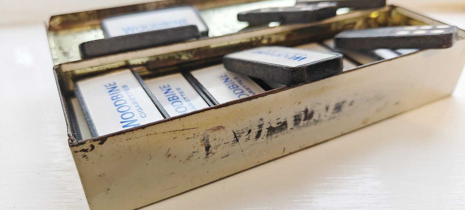 Woodbine. Cigarettes. Dominosæt i blikæske med reklame